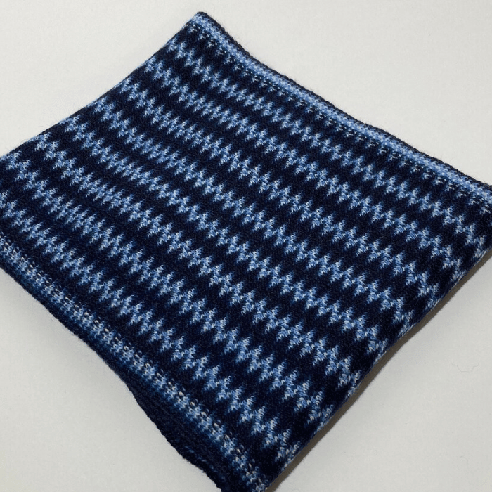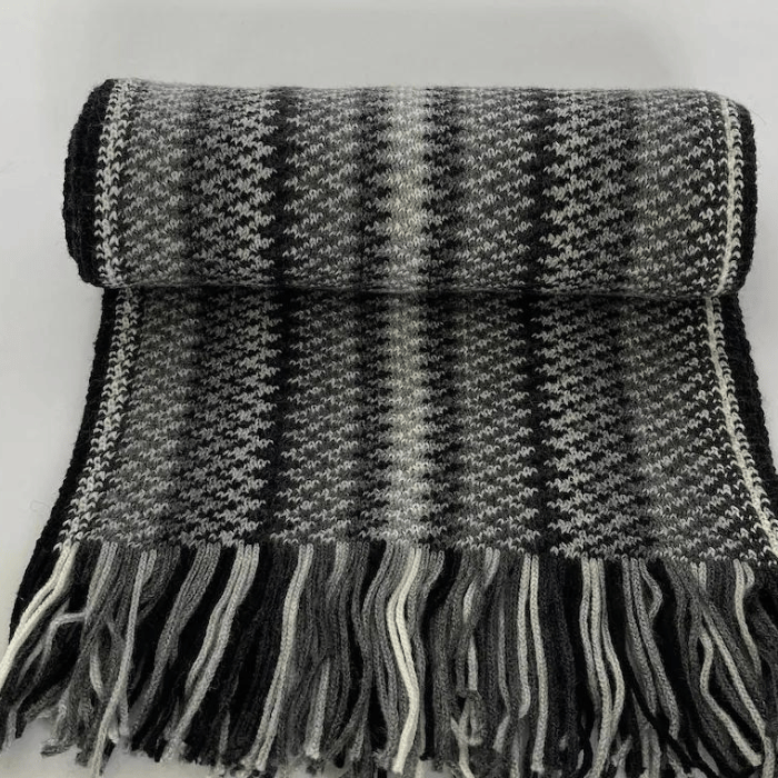 Our unique warp knitting process involves both vertical knitting and horizontal racking—moving three stitches back and forth—creating a beautifully intricate pattern. The single-ply yarn produces a lighter-weight scarf, providing warmth without bulk, making it perfect for layering during cooler months.